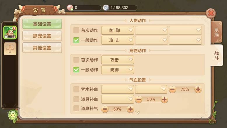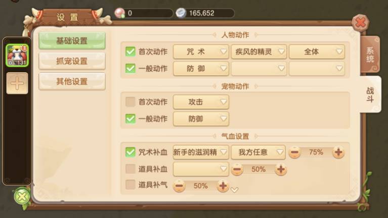 战斗设置:主号攻击宠物防御(追求极致主号可不带宠物离线挂机),小号1设置首回合属强,穿新手凯设置新手精灵战斗加血,见下图