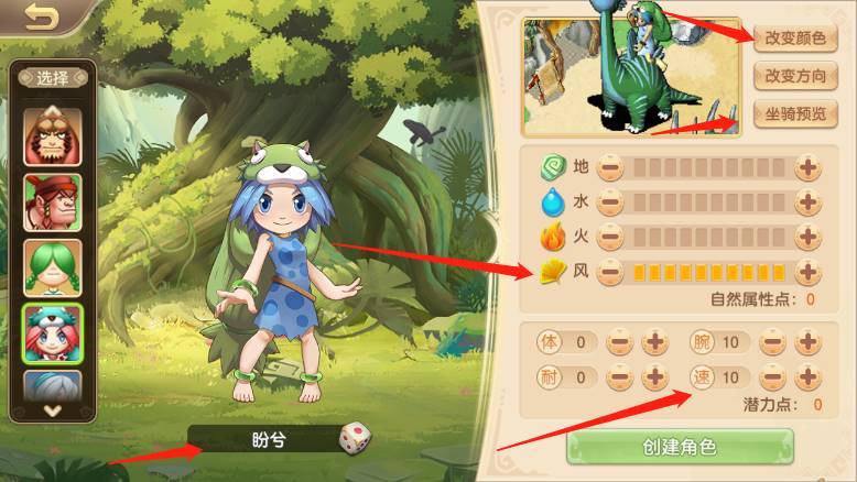 创建角色界面不要着急 1、填上自己心仪的昵称。 2、点击改变颜色、坐骑预览查看确定想用的坐骑。 3、元素属性选择个人推荐风,在波拉岛和涛之圣地相对轻松,其次地属性在波拉岛挂蓝雷比较轻松,涛之圣地中绿雷和灰雷同为地属性防高打起来有些吃力。 4、属性点10腕10敏,快速启动。 二、0转 新手指引不必多说做完传送挂机点开始挂机