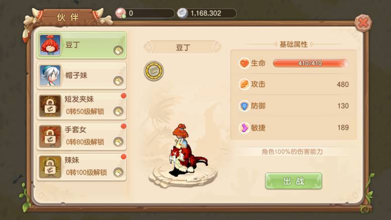 伙伴:建议只开豆丁和帽子妹,11万石币,0转时合击升级,伙伴的属性与人物加点相关,人物加腕力伙伴攻击增加,敏、防、血类推 武器:新手棒子 坐骑:骑虎。绿虎、黄虎可以在30级野外抓捕,红虎推荐60级野外抓捕。也可在70级完成“恐龙博士任务”取得绿、黄、红虎自选包。 装备:“空想套装”完成任务梦幻洞窟任务取得,三件套综合14防10敏。杉之手环伐木任务获得